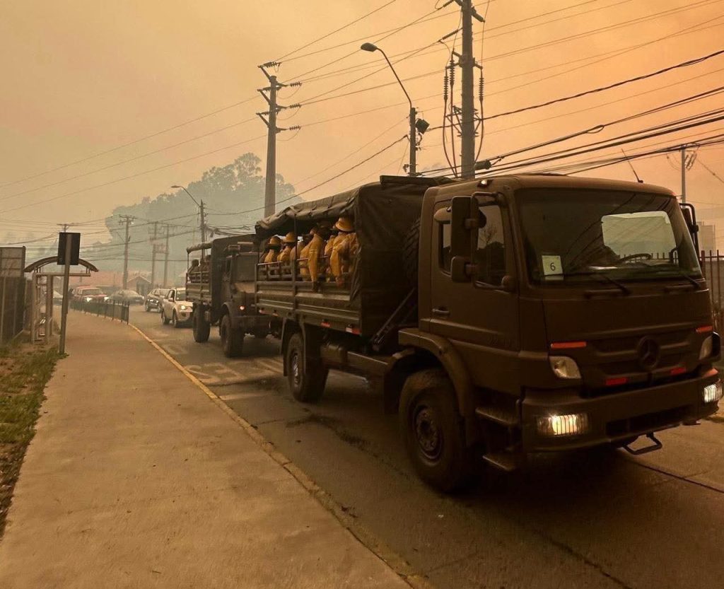 Ante la emergencia generada por los incendios forestales que afectan a las regiones del Bío Bío y Ñuble, el Ejército de Chile mantiene un despliegue activo de personal y medios para apoyar la respuesta coordinada por las autoridades civiles.