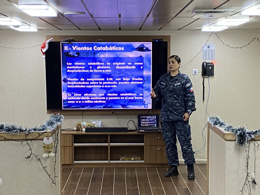 La instrucción estuvo a cargo de la Teniente Primero Meteorólogo Marilyn Rodríguez, Jefe del Centro Zonal, y la Empleada Civil Meteorólogo Claudia Pincheira, quienes se enfocaron en dar a conocer las principales configuraciones sinópticas, la dinámica de la atmósfera presente en el Mar de Drake, fundamental para poder efectuar el cruce de forma segura y condiciones adversas que se dan en la península antártica, como vientos catabáticos y concentraciones de hielo en el área de operación.