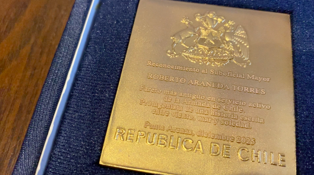 La medalla entregada cuenta con un relieve de la primera sesión del Congreso Nacional y en su reverso un escrito que señala “Reconocimiento al Suboficial Mayor Roberto Araneda Torres, farero más antiguo en servicio activo de la Armada de Chile. Protagonista de una historia escrita entre viento, mar y soledad. Punta Arenas, diciembre de 2025. República de Chile”, acompañado del relieve del escudo patrio.