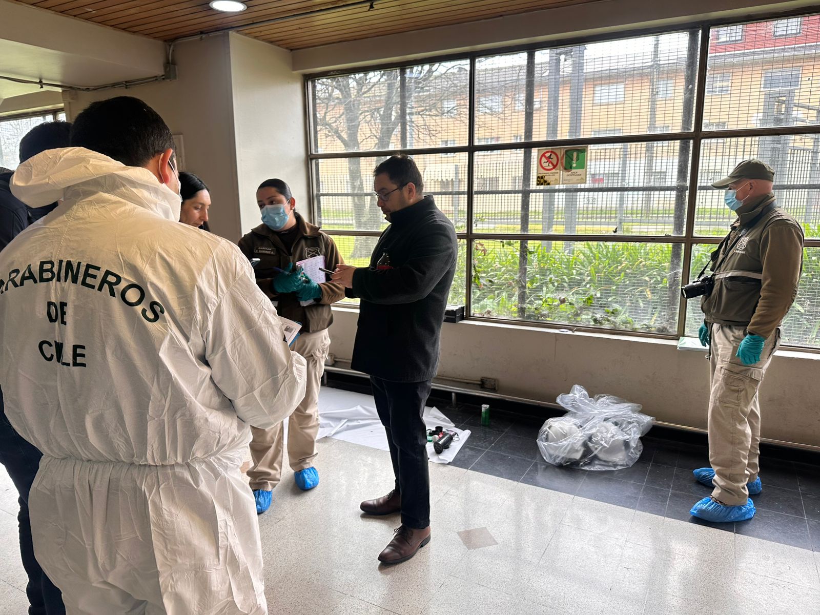 La Fiscalía instruyó la concurrencia del Laboratorio de Criminalística de Carabineros (Labocar), que trabaja en el levantamiento de evidencia biológica, huellas y revisión de grabaciones de seguridad para precisar la dinámica de los hechos.