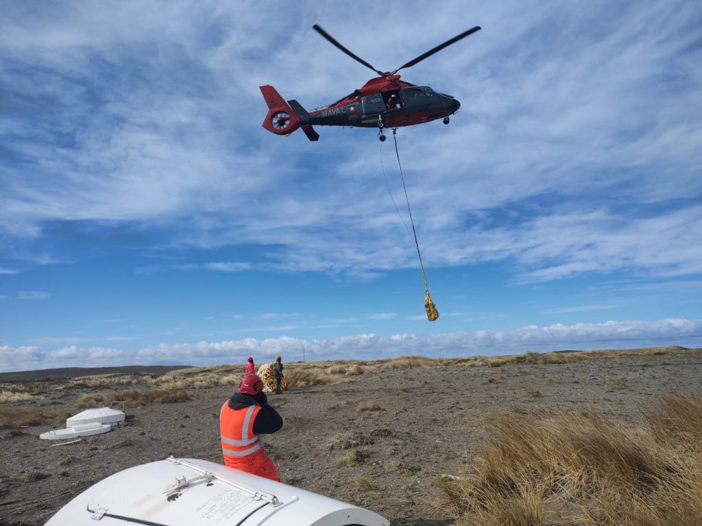 El apoyo del Grupo Aeronaval Sur por medio de un Helicóptero Naval, permitió realizar el transporte de las piezas modulares a los puntos específicos de trabajo, operando mediante el transporte de carga colgante, permitiendo con esta maniobra el movimiento de las piezas en lugares de difícil acceso para su posterior construcción.