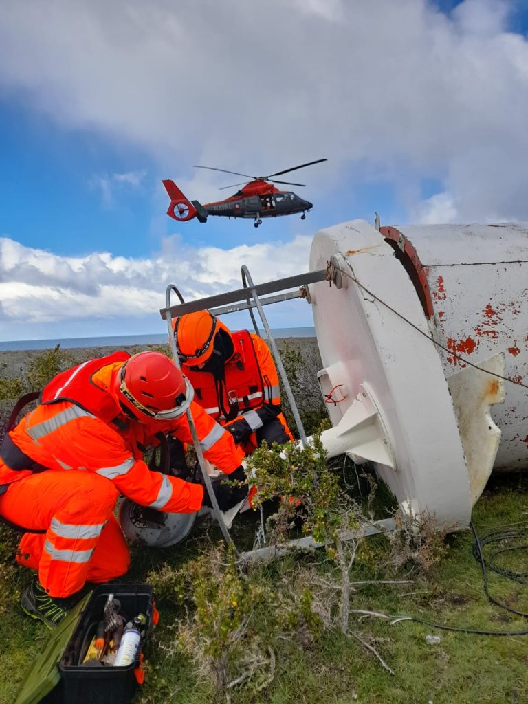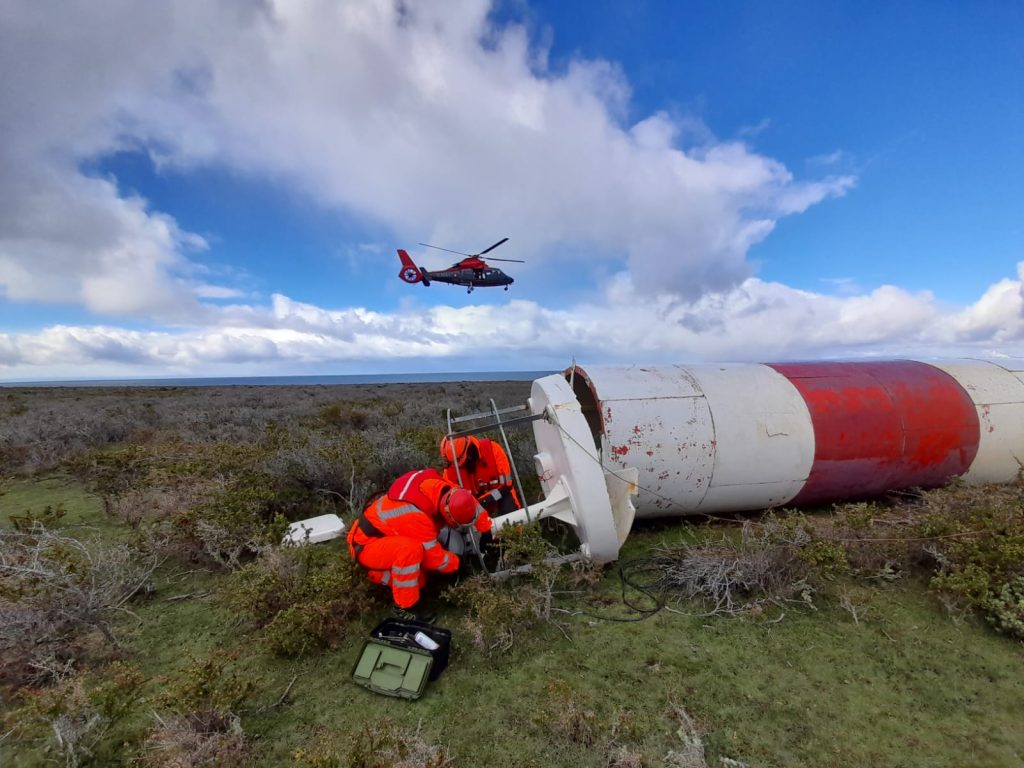 Entre el 11 al 17 de octubre, superando condiciones meteorológicas extremas, los especialistas en Faro del Centro Zonal de Señalización Marítima de Punta Arenas, culminaron la renovación de tres torres de ayuda a la navegación en el área de bahía Azul sector de Primera Angostura, en la zona norte del Tierra del Fuego.