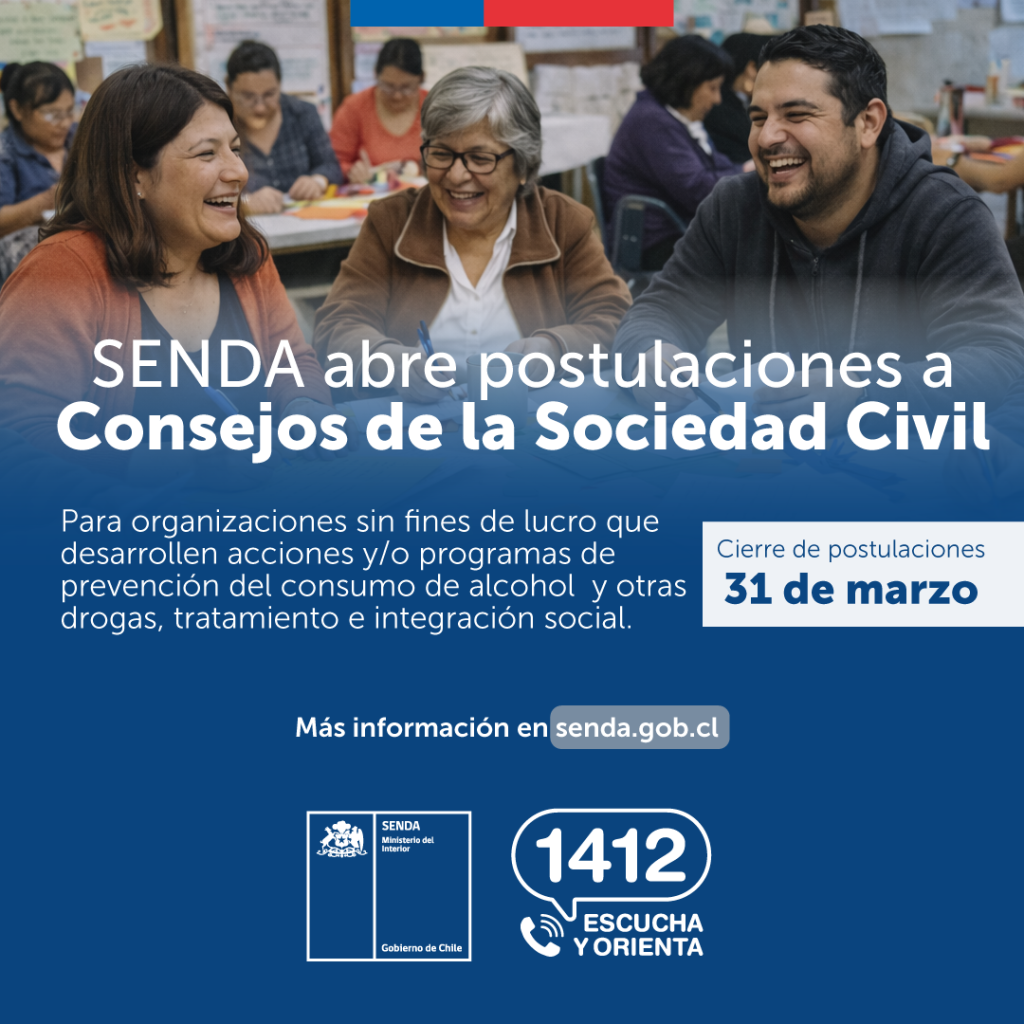 El Servicio Nacional para la Prevención y Rehabilitación del Consumo de Drogas y Alcohol, SENDA, inició el proceso de inscripción de organizaciones de la sociedad civil interesadas en integrar los Consejos de la Sociedad Civil (COSOC) regionales para el período 2026–2028, instancia que se desarrolla de manera simultánea en todas las regiones del país.
