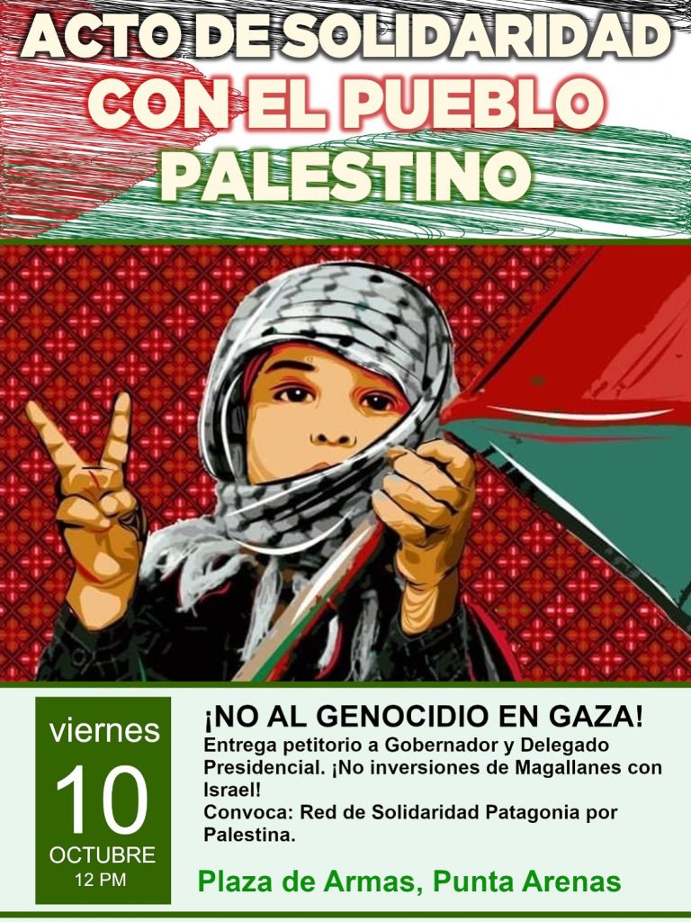 Desde el extremo austral del continente, la Red de Solidaridad Patagonia por Palestina convoca a la comunidad magallánica a una jornada pública de expresión solidaria con el pueblo palestino, ante el genocidio que continúa perpetrándose en la Franja de Gaza. Este viernes 10 de octubre, nos reuniremos en Plaza de Armas, al medio día para […]