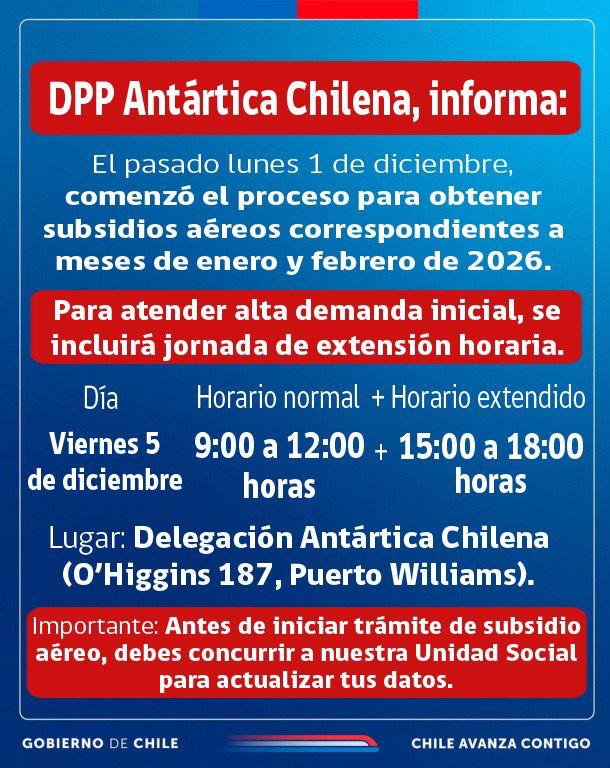 En dependencias de la Delegación Presidencial Provincial de la Antártica Chilena, se ha estado llevando a cabo esta acción. Ante la alta demanda para estos meses que coinciden con las vacaciones de verano, se ha reforzado el servicio con jornadas de extensión horaria por parte de las unidades de subsidio aéreo y social, algo que se replicará este viernes 5 de diciembre: además del horario normal, entre las 9:00 y 12:00 horas, se añadirá atención extraordinaria entre las 15:00 y 18:00 horas.
